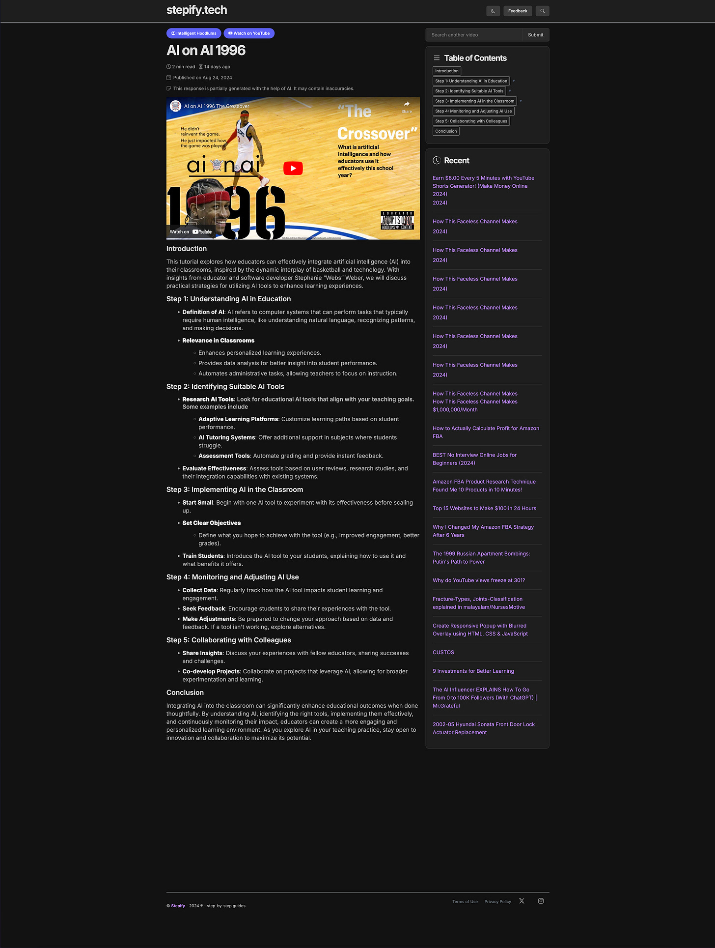 There's not a lot to complain about with Stepify. It would be great if they added time stamps to steps so that a viewer would know where to go to listen to the content they're reading. With a price tag of "0," this would be nitpicking. Like any ai tool, care should be given to evaluate the output of the tool for accuracy before sharing with learners.
