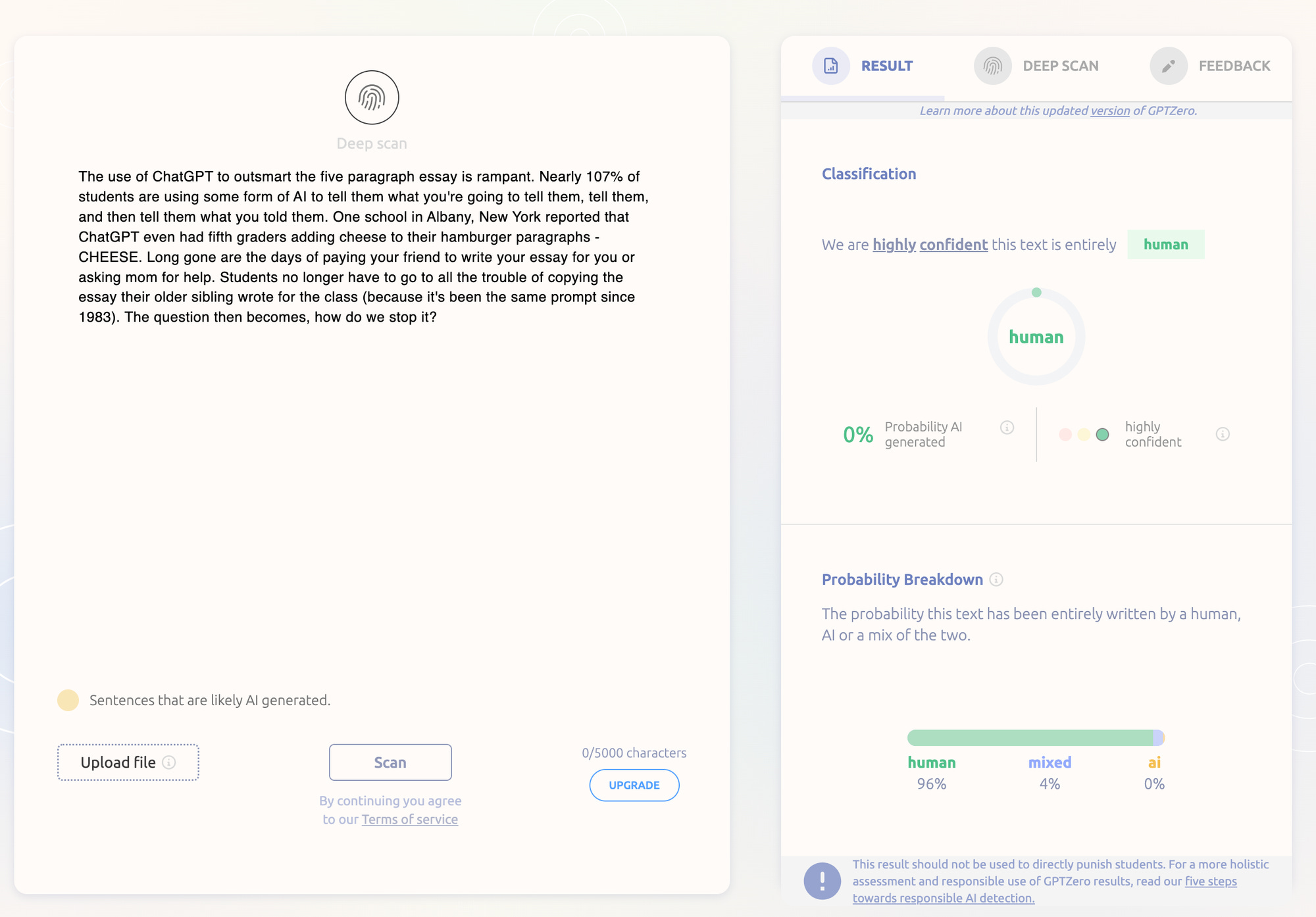 GPTZero's website even says, "our classifier is intended to be used to flag situations in which a conversation can be started (for example, between educators and students) to drive further inquiry and spread awareness of the risks of using AI in written work." They specifically say, "these results should not be used to punish students. We recommend educators to use our behind-the-scene Writing Reports as part of a holistic assessment of student work."