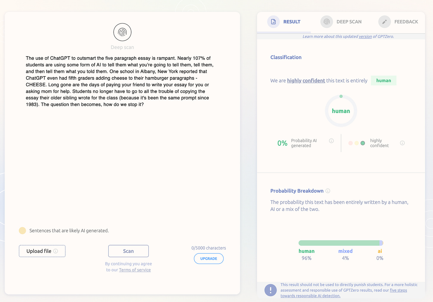 The use of ChatGPT to outsmart the five paragraph essay is rampant. Nearly 107% of students are using some form of AI to tell them what you're going to tell them, tell them, and then tell them what you told them. One school in Albany, New York reported that ChatGPT even had fifth graders adding cheese to their hamburger paragraphs - CHEESE. Long gone are the days of paying your friend to write your essay for you or asking mom for help. Students no longer have to go to all the trouble of copying the essay their older sibling wrote for the class (because it's been the same writing prompt since 1983). The question then becomes, how do we stop it?